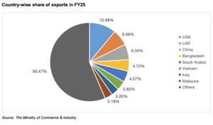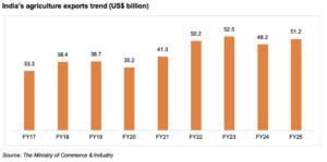 The major importing countries of agricultural products from India in FY25 were the United States, UAE, China, and Bangladesh. The United States became the leading importer of agricultural products from India, buying agricultural products worth US$ 5.62 billion, which accounted for close to 11% of India’s total agricultural exports. This indicates the increasing demand for Indian food products in the global market.